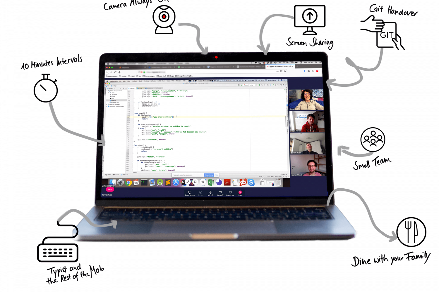 With on-site Mob Programming, you just pass on the keyboard to hand over to the next person. This is a challenge for a distributed team.